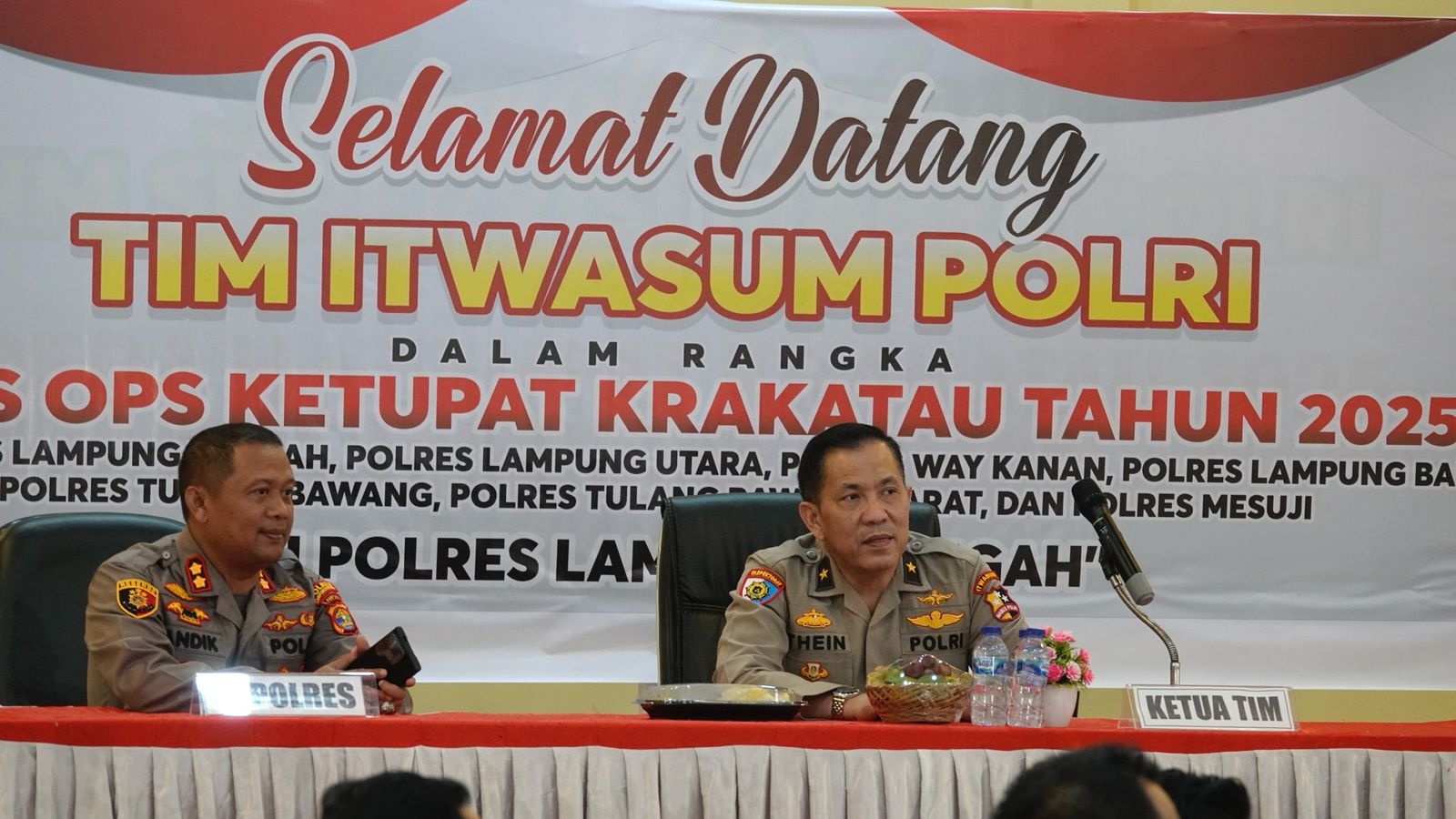 Setelah transit diruang kerja Kapolres Lampung Tengah sebagai tuan rumah, Tim Was Ops kemudian melakukan pemeriksaan terkait pelaksanaan Ops Ketupat Krakatau 2025 di Aula Atmani Wedhana Mapolres setempat.