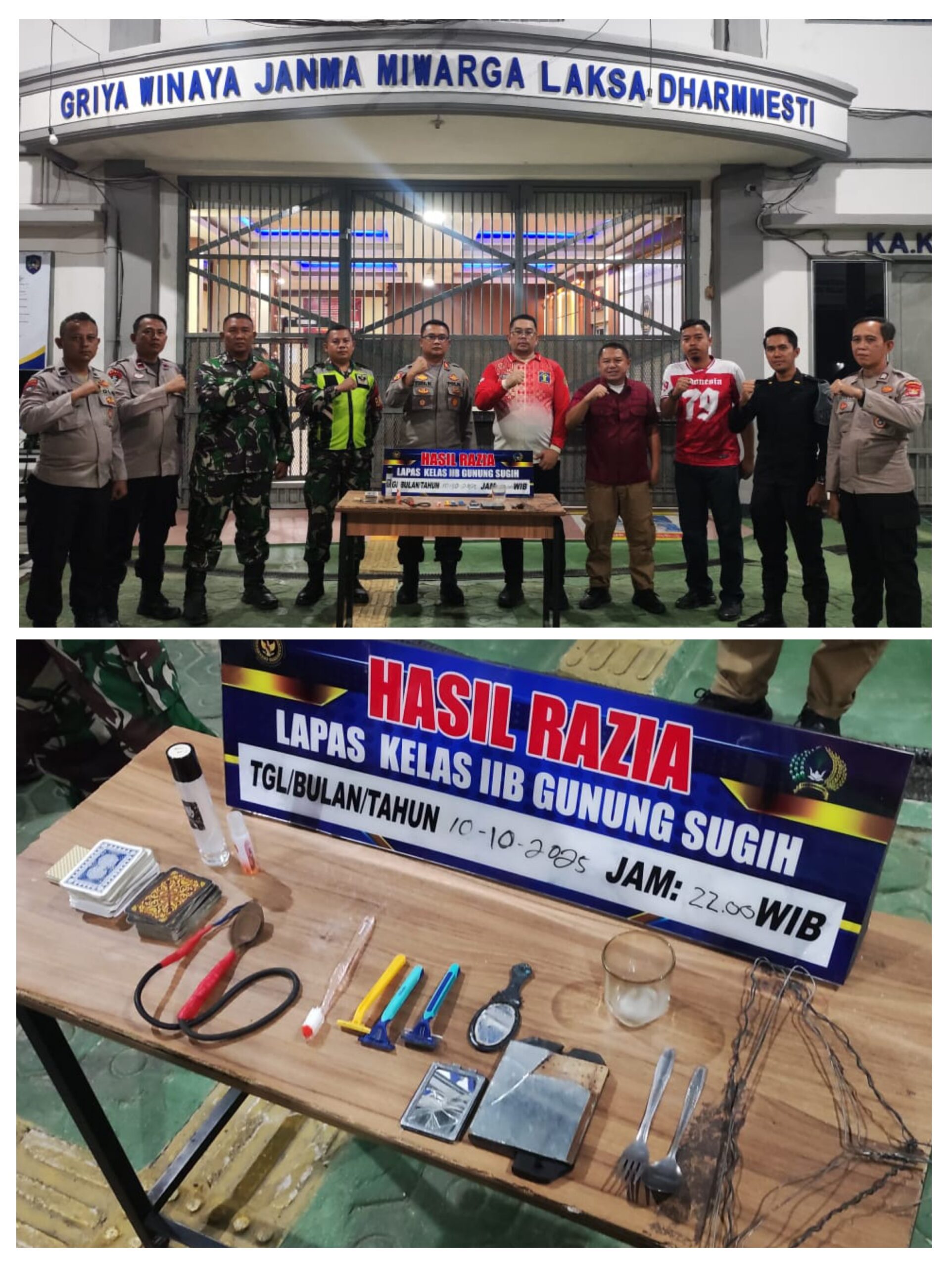 Dalam memperkuat sinergi antar aparat penegak hukum serta menciptakan lingkungan pemasyarakatan yang bersih dari penyalahgunaan narkotika, Lapas Kelas IIB Gunung Sugih melaksanakan razia gabungan bersama Kepolisian Sektor (Polsek) Gunung Sugih dan TNI dari Koramil Gunung Sugih pada, Jumat (10/10) malam.