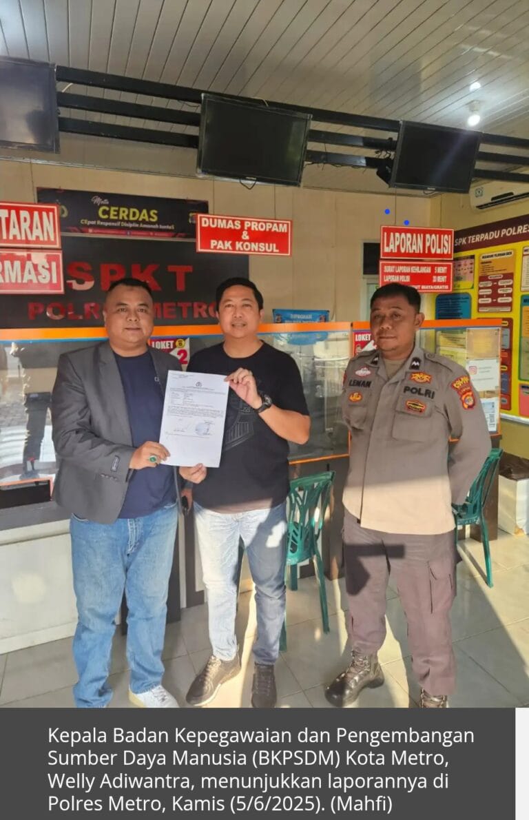 Metro – (KIM) – Kepala Badan Kepegawaian dan Pengembangan Sumber Daya Manusia (BKPSDM) Kota Metro, Welly Adiwantra, resmi melaporkan dugaan pencemaran nama baik ke Polres Metro.