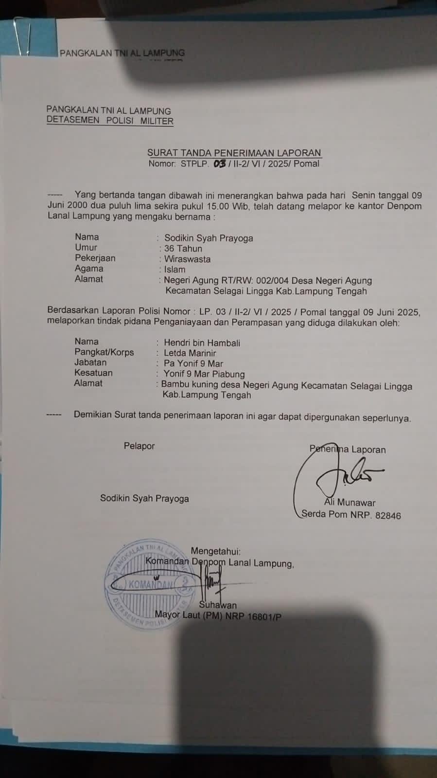 Oknum Perwira TNI AL Dilaporkan Ke Pomal Lampung Diduga Melakukan Penganiayaan Dan Perampokan Salah Sasaran Kepada Seorang Warga Negeri Agung Lamteng