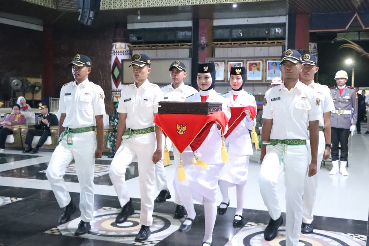 Lampung Tengah – (KIM) – Bupati Lampung Tengah, H. Ardito Wijaya, bertindak sebagai pembina upacara dalam Pelantikan Pasukan Pengibar Bendera Pusaka (Paskibraka) Kabupaten Lampung Tengah Tahun 2025. Kegiatan tersebut berlangsung khidmat di Gedung Sesat Agung Nuwo Balak, Gunung Sugih, pada Jumat malam (15/8/2025).