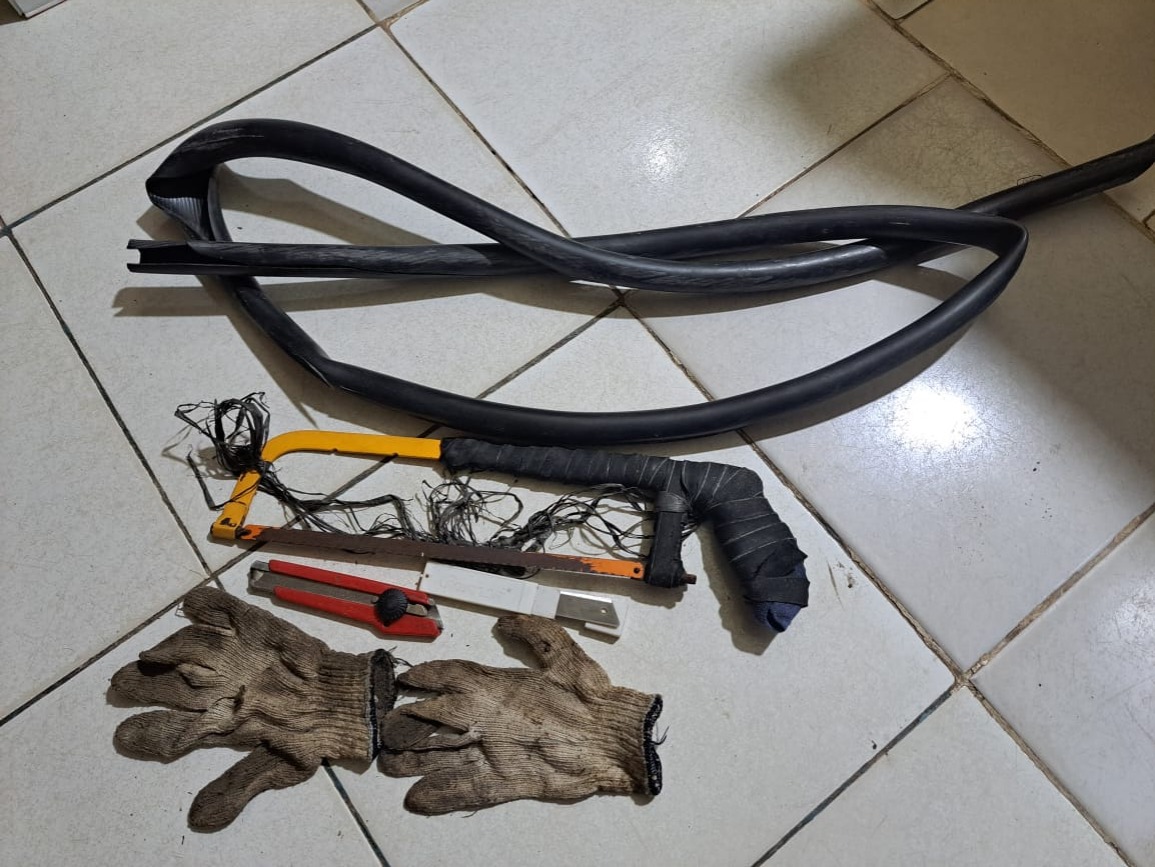 Selain itu, Polisi pun berhasil mengamankan barang bukti berupa 1 pasang sarung tangan, 1 buah kulit kabel warna hitam, 1 buah gergaji, 1 buah cutter dan isi cutter dari tangan pelaku.