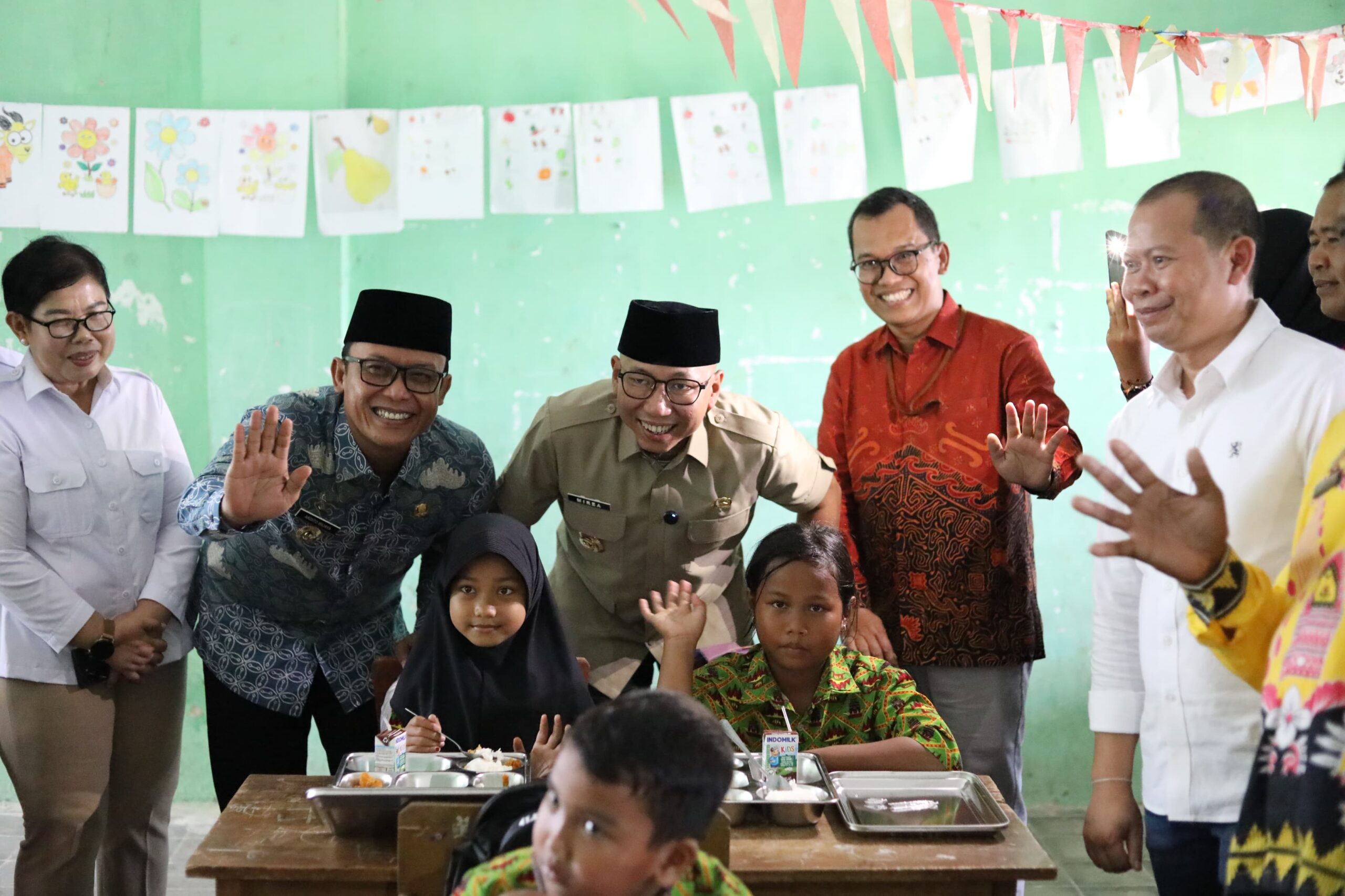 Setelah sambutan, acara dilanjutkan dengan peninjauan langsung dapur makan dan pembagian makanan bergizi dan pemberian makan bergizi gratis kepada anak-anak SD 2 Rama Indra.