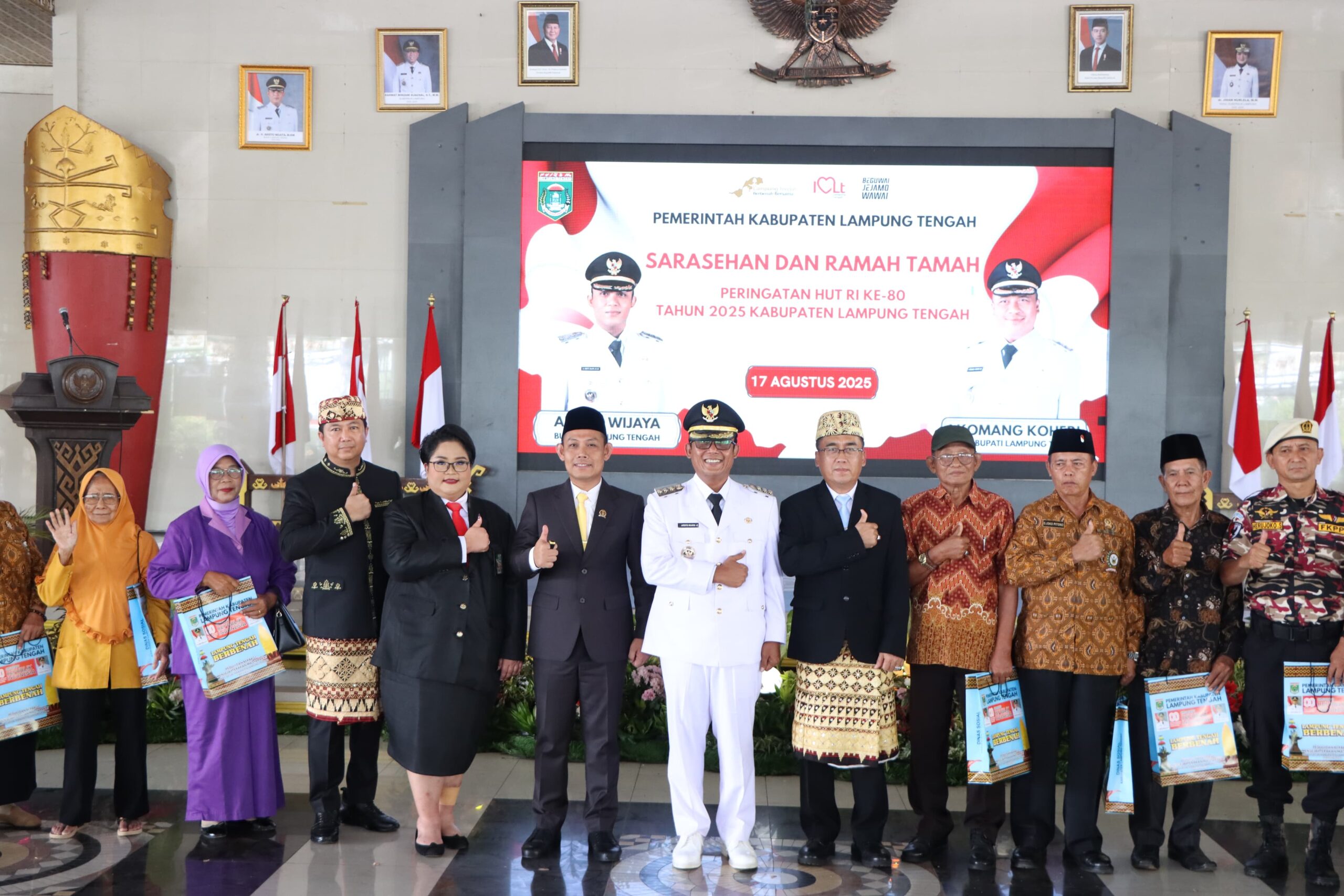 Lampung Tengah – (KIM) – Usai pelaksanaan upacara HUT ke-80 Kemerdekaan Republik Indonesia, Bupati Lampung Tengah, Ardito Wijaya, menghadiri acara penyerahan remisi serta ramah tamah bersama para pejuang dan penerus bangsa di Gedung Sesat Agung Nuwo Balak, Gunung Sugih, Minggu (17/8/2025).