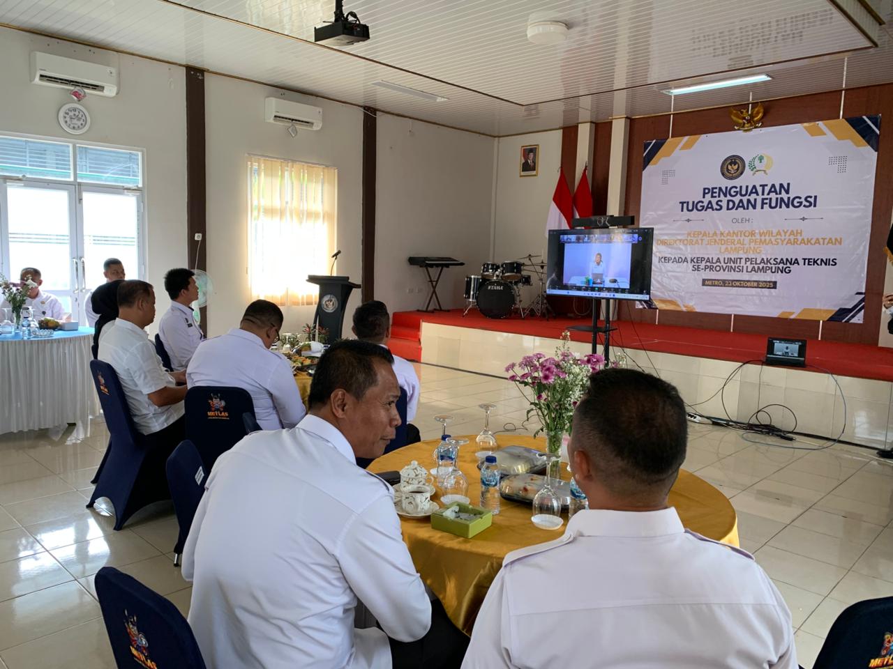 Gunung Sugih – (KIM) – Sukseskan 13 Program Menteri Imigrasi dan Pemasyarakatan, Agus Andrianto, Kepala Lembaga Pemasyarakatan (Lapas) Kelas IIB Gunung Sugih, Sastra Irawan mengikuti Penguatan Tugas dan Fungsi Pemasyarakatan Kepala Kantor Wilayah Direktorat Jenderal Pemasyarakatan Lampung, Jalu Yuswa Panjang, bertempat di Lembaga Pemasyarakatan Kelas IIA Metro, Kamis (23/10).