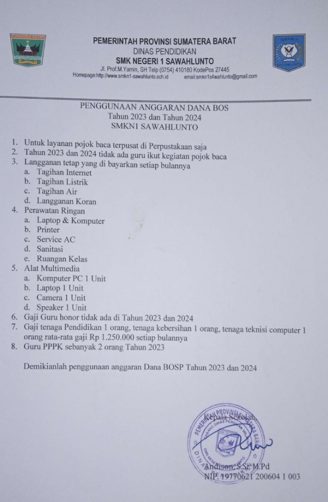 Sementara data yang dihimpun tim investigasi pada tahun 2023-2024 SMKN 1 SAWAHLUNTO mendapatkan kucuran dana bosp sebesar Rp 1.729.980.000,.